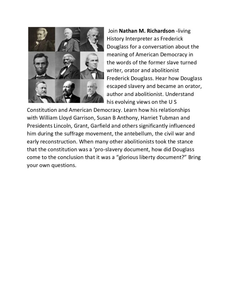 The public is invited to join Frederick Douglass for a conversation about the meaning of American Democracy in the words of the former slave turned writer, orator, and abolitionist. This program will be an educational experience that is appropriate for historians of all ages. Additionally, Ron Coddington from “Military Images” magazine will be on hand with a display on the United States Colored Troops (USCT) during the Civil War.